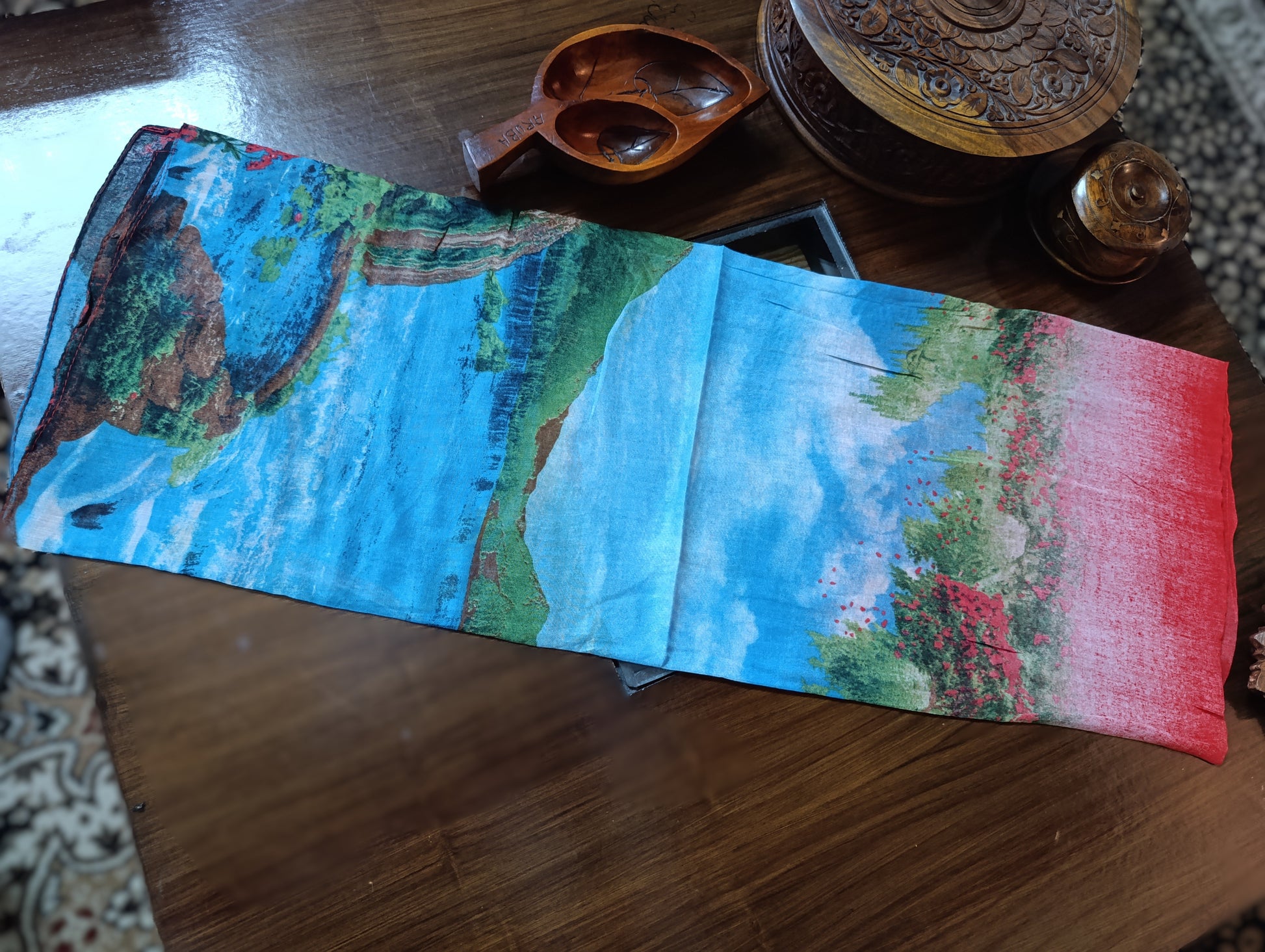 Embrace the breezy elegance with stoles adorned in serene scenic prints—where nature meets fashion.