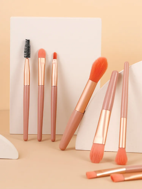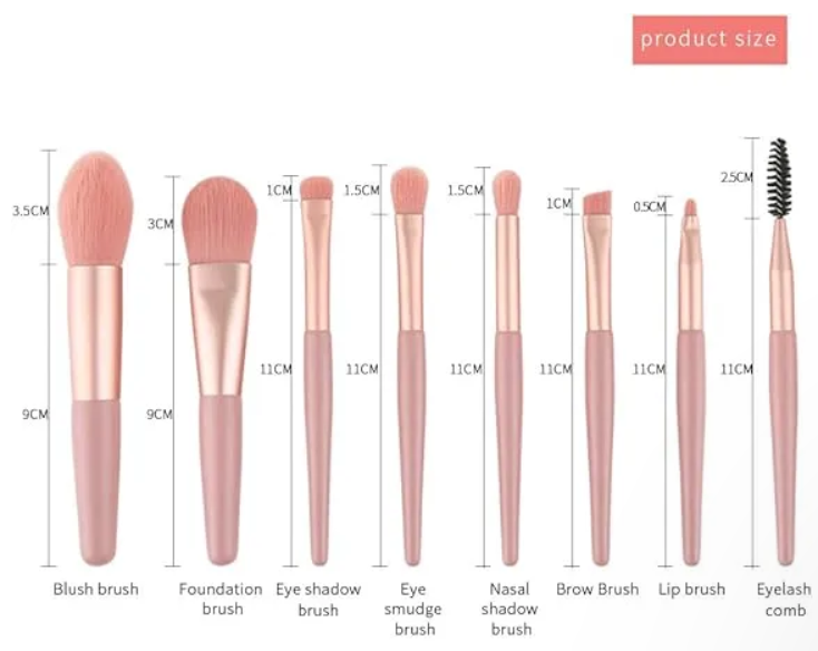 - This Blusher Set contains: Cheek brush x 1, Foundation Brush x1, eyebrow brush x1, blending brush x1, Angled brush x1, Eyelash brush x1, Nose shadow brush x1, Lip brush x1